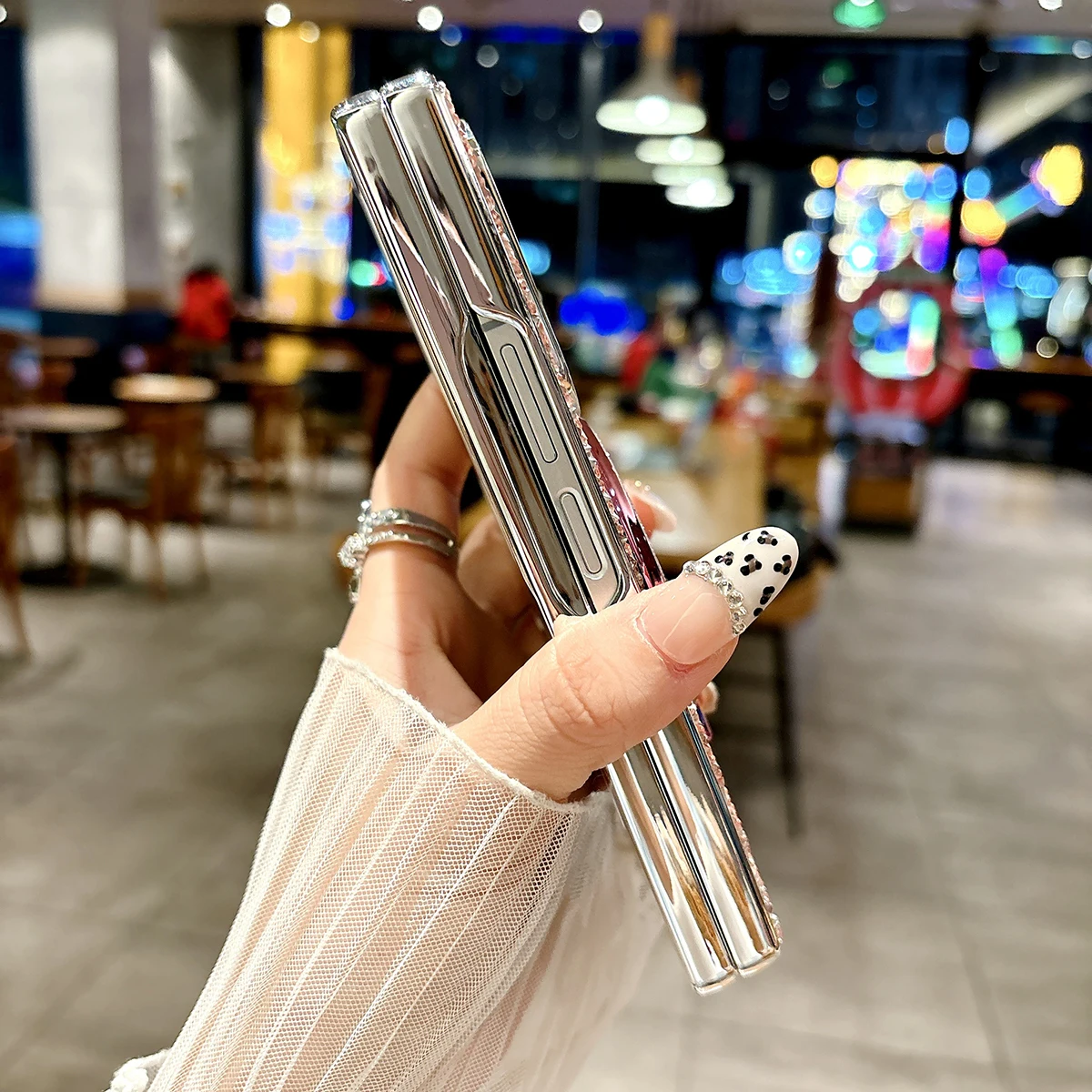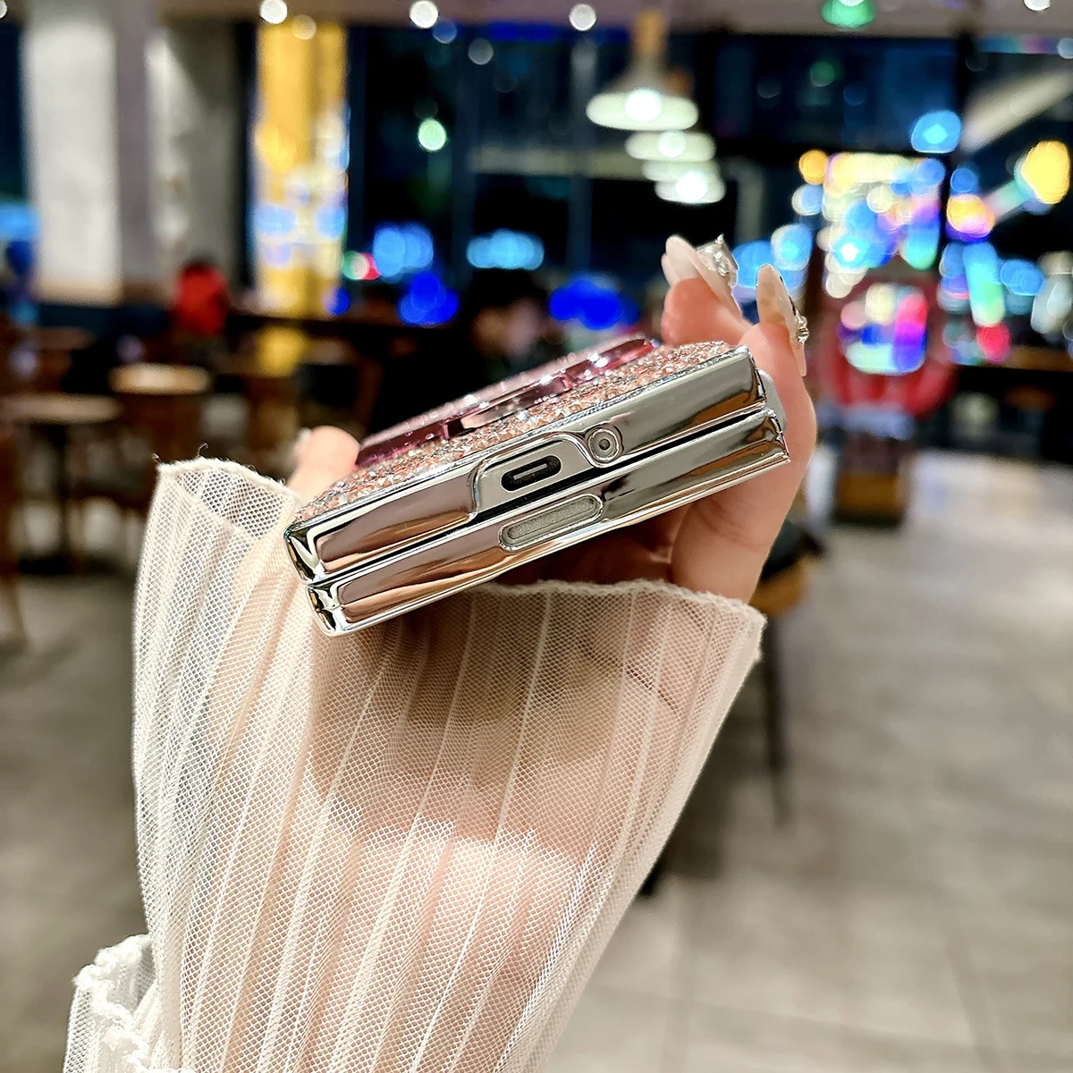 Stylish and sparkly Samsung Galaxy Z Fold case features a glittering colorful design with a built-in ring holder that doubles as a mirror for on-the-go makeup touch-ups. Perfect blend of elegance and function.